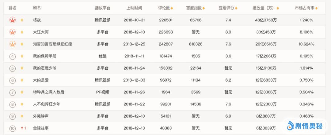 2019年1月6日《骨朵传媒电视剧总榜》前十名中有六部都是爱情片
