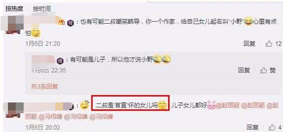 要知道韩寒的女儿就叫“小野”,所以,对于冯绍峰这四字回应也引来不少网友争议,其中,有网友便留言表示:“二叔是官宣怀的女儿吗?”对此,有网友也反驳道:“也有可能是二叔在嘲笑韩导,你一个作家给自己女儿起名叫小野,心里有点怕!”