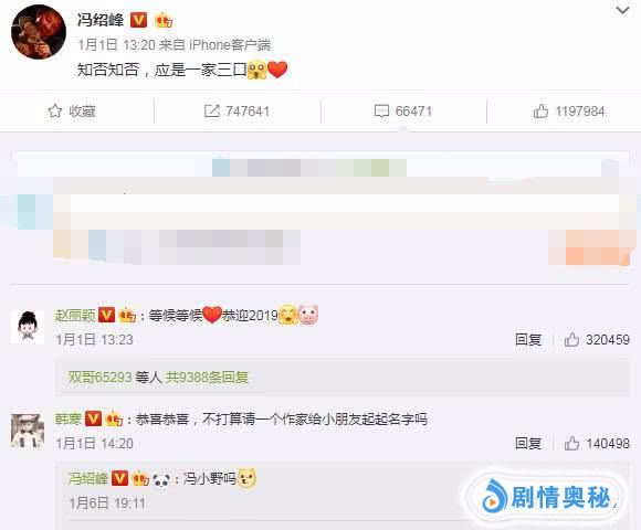 其中,对于韩寒:“不打算请一个作家给小朋友起起名字吗?”的留言,时隔5天,和老婆赵丽颖度完假的冯绍峰也终于做了回应表示:“冯小野吗?”