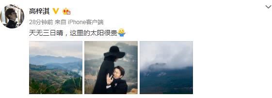 谈及高梓淇,曾在《新还珠格格》中饰演箫剑的他也曾给人留下深刻的印象,今日(1月8日),在贵州拍戏的高梓淇也在微博晒出一组照片,并附文:“天无三日晴,这里的太阳很贵”。