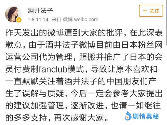 1月8日中午11时许,在舆论的高压之下,酒井法子终于发文做出澄清和说明。酒井法子在表达歉意之后,对误解做出了以下几点说明:1、微博非我本人打理,是由日本粉丝网运营公司代为管理;2、在日本饭圈一直流行着会员付费的模式,即粉丝要想加入明星后援会或粉丝团,就必须付钱才能进。