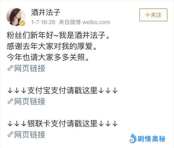 1月7日下午4点半左右,日本女艺人酒井法子在微博上发文向粉丝道“新年好”,并对喜爱自己的中国粉丝表达了感谢。但两句致谢的话刚说完,紧接着就贴出两条让粉丝付款入会的链接,此举让国内网友震惊不已,被多数网友质疑这是公开的“在线乞讨”,严重有损艺人形象。