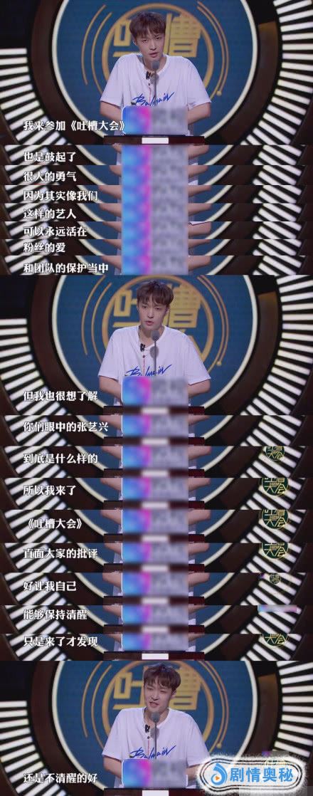 相信看过《吐槽大会》的网友们应该都知道,能出现在这个舞台上的嘉宾应该都是具有一定的勇气的,不说平时再怎么心胸豁达,经过这节目上众多嘉宾的轮番轰炸,还是多少有点难过的。就好比这次的张艺兴,也是直接被几位吐槽成“白莲花”、“电视剧抠图”、“音乐歌词不行”等等,张艺兴本人也是直接表示让摄影师先多拍几个自己笑的镜头,因为怕自己一会笑不出来了。不过网友们对于张艺兴的表情也是褒贬不一,有网友表示:“张艺兴玻璃心,玩不起”也有网友表示:“努力不应被嘲笑”、“ 敢直面真实的声音,敢上这个节目,就很佩服他”等等,不知道网友们对此怎么看呢?