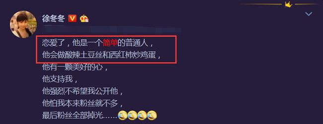 但其实早在去年的时候,徐冬冬就已经在网上发文承认自己有男友的事情了,但是考虑到事业,所以一直没有公开男方,而且从徐冬冬的言语之中不难看出这个男人对她非常好,经常会给她做饭,也很为她考虑,徐冬冬甚至说他只是“一个简单的普通人”。