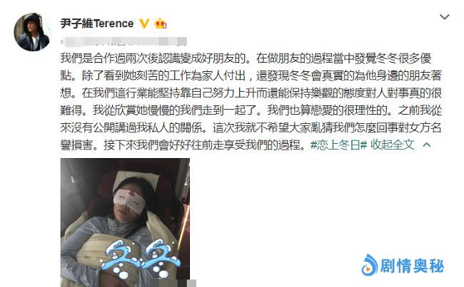 最主要的是,在两人被拍到之后,尹子维也在网上大方的正式公布两人的关系,因为担心网友们的乱猜测会对自己女友造成名誉上的损坏,所以这次尹子维选择大方官宣,并且向大众表示“接下来我们会好好往前走享受我们的过程”,从这一点也看得出来尹子维是一个很负责任和值得托付的男人。