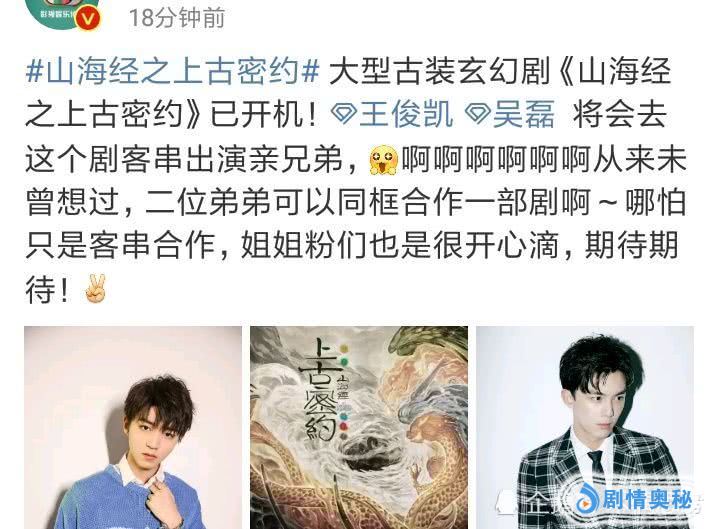 最近有一部新剧已经低调开机了,那就是《山海经之上古密约》了。这部剧是大型古装玄幻题材,主演的阵容也是非常强大的。而据知情人士爆料,这部剧当中会有两位当红小生加盟客串,他们就是王俊凯和吴磊了。