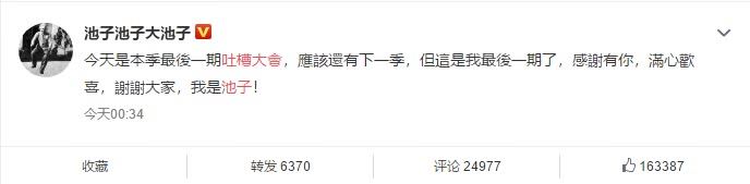 1月7日凌晨,池子发微博宣布退出吐槽大会,原文如下:“今天是本季最後一期吐槽大會,應該還有下一季,但這是我最後一期了,感謝有你,滿心歡喜,謝謝大家,我是池子! ”池子的临别宣言引发网友热议。