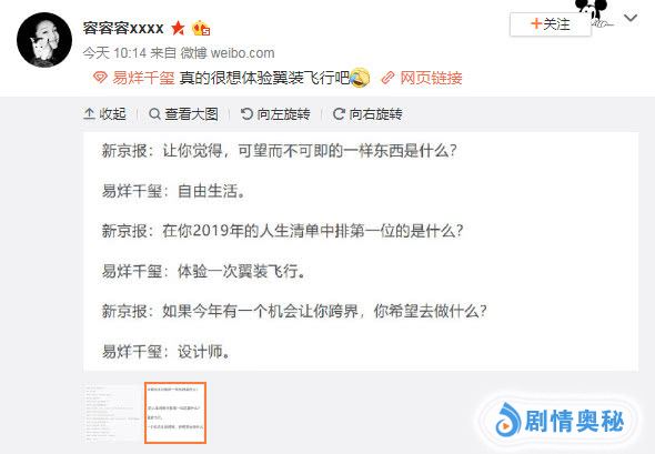 展望2019年,易烊千玺则表示,希望在2019年里可以体验一次翼装飞行!这个愿望吓坏了不少千纸鹤,因为翼装飞行需要在高空中进行,对于许多恐高的千纸鹤而言实在是太恐怖了!同时,易烊千玺本人也有一些恐高,因此粉丝们便觉得这项运动太危险了!