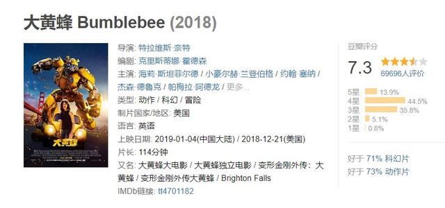 最初在听到《变形金刚》的衍生电影时是有些抗拒的,但出于对《变形金刚》的喜爱还是去看了下这部可以说是《大黄蜂》外传的电影。作为商业电影,它是及格的,但并没有期待中激烈刺激的大场面,相较《变形金刚》还是差了些,评分7.3也还不错。