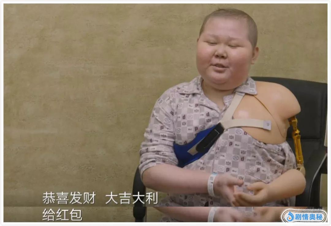 安仔的美容手安装好了,他用右手握着假肢,做出恭喜发财的手势,还不忘讨要红包。