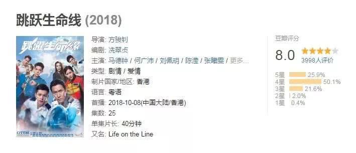 在这样的环境下,悬疑探案剧迷们已经被培养的口味愈加刁钻,对剧集的要求也水涨船高,TVB如果只是继续中规中矩的产出内容而不能带来眼前一亮的惊喜,自然就难以突围。不过好在在“职业剧”上,TVB的优势仍旧存在,例如像《东方华尔街》这种“硬商战”的金融题材,内地剧集就很难去掌控。并且,除了在挖掘“专业深度”上可圈可点,TVB职业剧涉及职业的范围之广、分类之细也是内地剧集难以企及的。就比如豆瓣评分8.0的年度港剧口碑之冠《跳跃生命线》,以“救护员”这个特殊的职业作为切入点,非常的有新意。