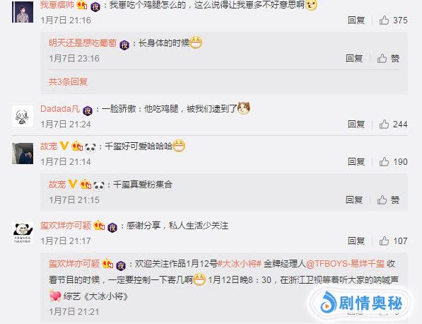 所以说之前易烊千玺因为在食堂啃鸡腿上热搜的时候,是这两位学长问千玺要的合照吗?用的词也是非常爆笑了“逮着了”,我们大佬是有多心酸呀,去食堂吃个鸡腿还会被逮着了。粉丝们看完这个采访也都表示笑惨了。留言表示:“为什么要逮着,吃个鸡腿很正常啊”、“我们大佬不要面子的吗”、“长身体喜欢多吃”……
