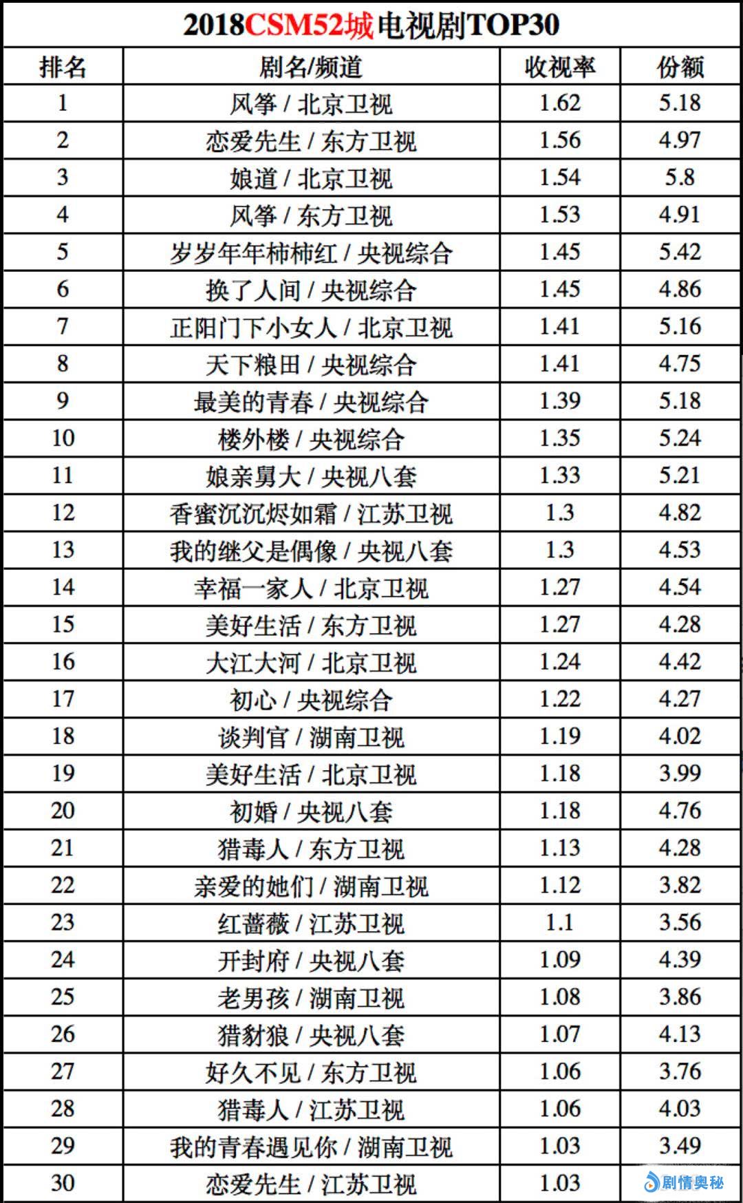 CSM52城,2018年没有一部剧平均收视率破2,年度收视率前3的剧目是《风筝》、《娘道》、《恋爱先生》。《香蜜沉沉烬如霜》只能在省级卫视播出榜单中排第4,在含央视的榜单中难进前10。