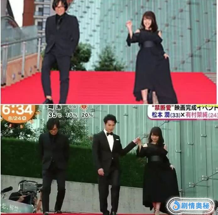 有杰尼斯艺人出席的电影发布会。网络媒体登载图片(上)与电视转播截图(下)的对比