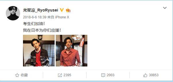 而这些日本艺人对微博的打理和更博频率,也比“前辈”们要走心得多。木村拓哉第一条微博便是用中文问好的视频,绫野刚的文案总是中日双语。而在高考当天,今年开通微博的数位日本演员都送上了对中国高考学子的祝福。