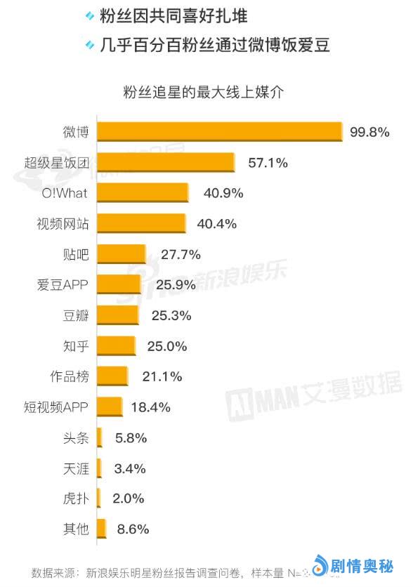 而在对两万名粉丝的调查当中,有99.8%的人选择在微博上追星,60.4%的人通过微博了解明星的内容和动态。这使得微博成为饭圈最大的线上“根据地”。