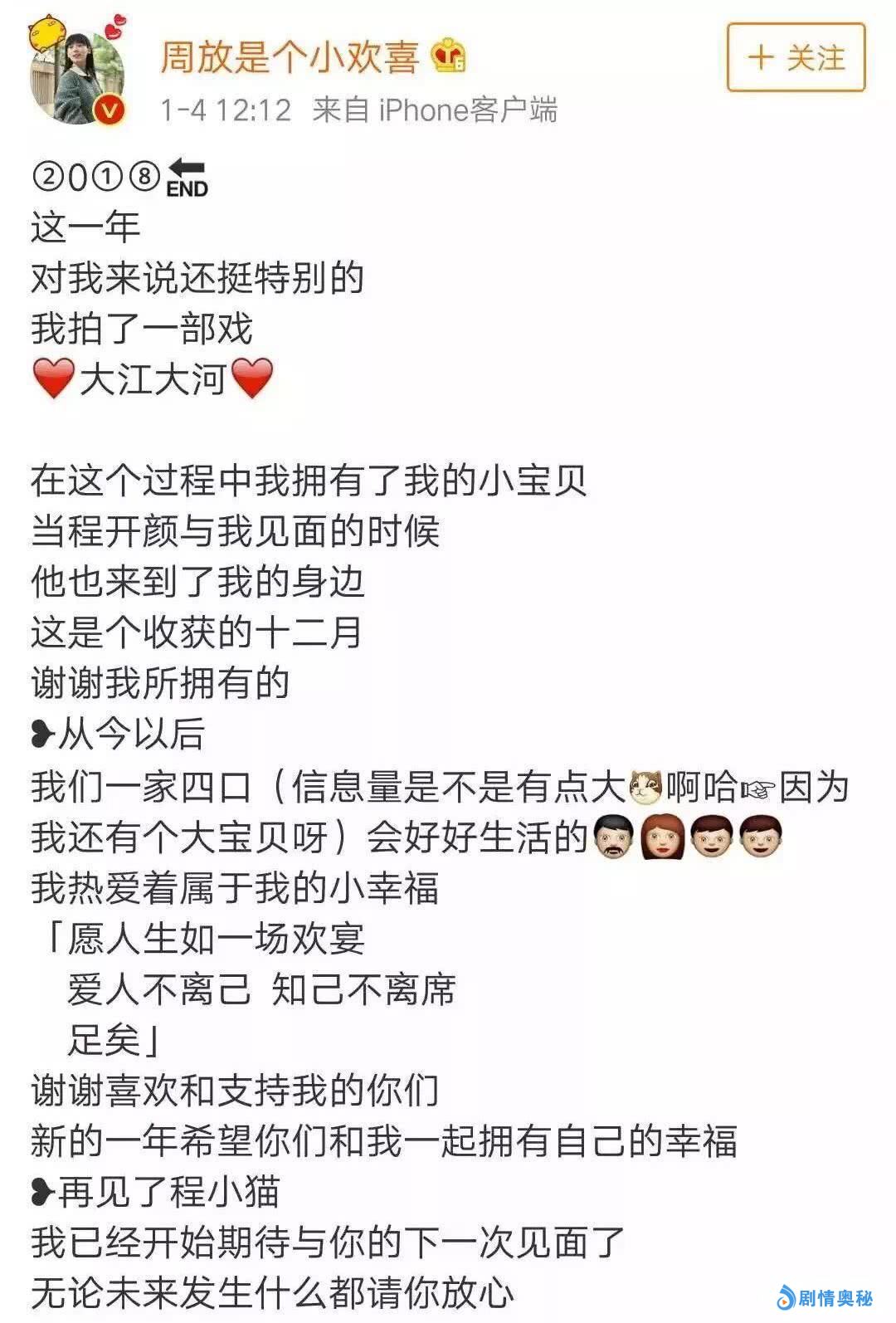 原著中虽然宋运辉越走越远,和程开颜的距离越拉越大,让她疑心重重,最后没有逃开离婚的命运。现实中的周放也让出乎意外,她是1989年出生,但却已经是两个孩子的母亲了,她在微博中发出,在拍摄《大江大河》的过程中,自己有了第二胎,一家四口的幸福生活正式开启。网友们看到这个消息,简直都不敢相信,没听说她什么时候结婚的,却有两个孩子了。