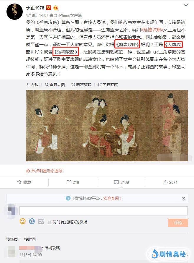 近日,一直在网上传出了于正继《延禧攻略》之后,又将再拍摄一部电视剧《盛唐攻略》的消息,但是网友们还没有等到电视剧官方的宣布,却先等来了于正自己的曝光,不过以于正的个性来看,这也已经不是第一次了。不过这次于正并不像以往那样只是表达自己不接受吐槽的心情,而是破天荒的在网上征求起网友们的意见。