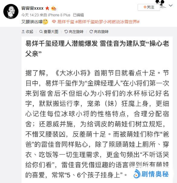 而作为领队的雷佳音则是在大事小事上都操碎了心,成了小将口中的“操心老爸”。因为易烊千玺要带领小将们训练冰球,那么一些后勤的工作就得归雷佳音管了。“老爸”雷佳音不光要照顾萌娃们穿衣、吃饭,就连上厕所也由他负责,确实非常辛苦了!粉丝们看到这样的描述,纷纷调侃起了二人,表示:这个搭配不是典型的“严母慈父”吗?