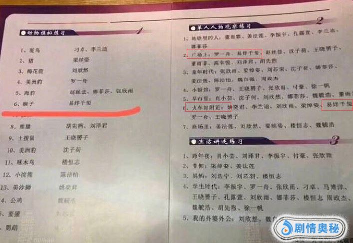 而在单人人物观察练习中,易烊千玺的主题是广场上和胡先煦一起,看起来两位室友好友又可以一起和做表演了呢!除此之外易烊千玺还需要观察并展现出火车站附近人们的情况,在这个练习中易烊千玺的名字出现了两次,看来我们大佬需要准备表演两次呀。