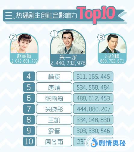 在最新出炉的热播剧演员影响力排名中,位列榜单前五名的电视演员依次是出演《知否知否》男二号齐衡的朱一龙、出演《知否知否》女一号盛明兰的赵丽颖、出演《知否知否》男一号的冯绍峰、杨紫,以及与吴卓羲携手主演《格子间女人》的唐嫣,其中拿下前三名的热播剧《知否知否》大获全胜,完美演绎齐衡的拢龙更是一骑绝尘位居榜首,这位实力派演员的演技得到了观众的一致认可。