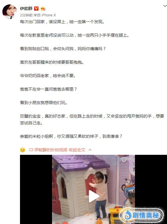 1月9日,身为妈妈的伊能静便又在微博晒出一段关于2周岁的女儿小米粒的小视频。从伊能静的描述中可以得知,这是她带着女儿去游乐园拍摄的小视频。