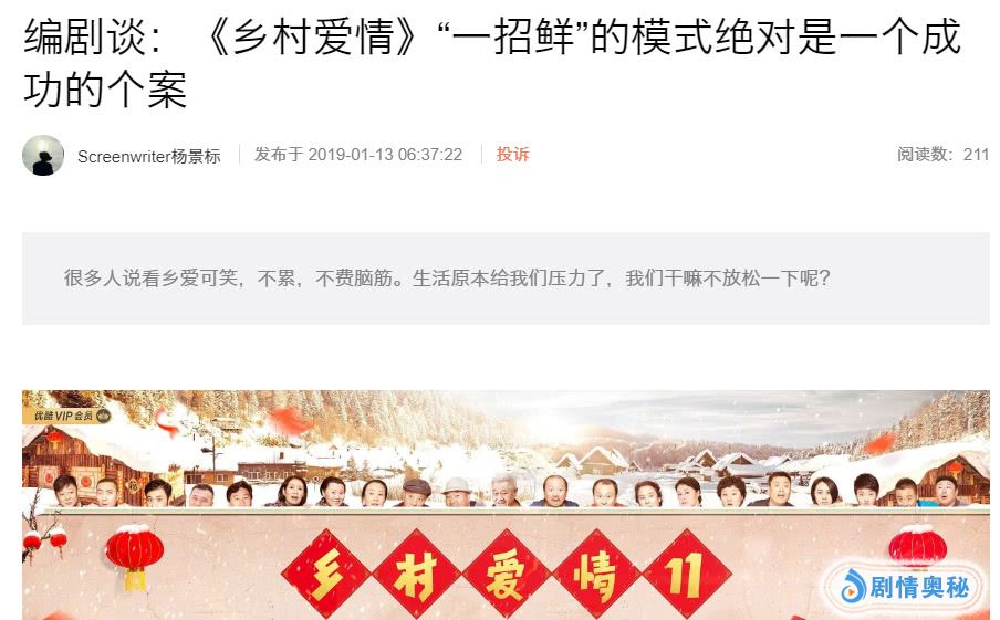 13日清晨,编剧杨景标微博发了一篇文章,题为:《乡村爱情》“一招鲜”的模式绝对是一个成功的个案。在引言中,杨景标就用了一句话来形容《乡村爱情》:很多人说看乡爱可笑,不累,不费脑筋。生活原本给我们压力了,我们干嘛不放松一下呢?