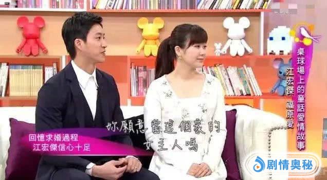 后来福原爱主动找到江宏杰,把心中的害怕主动说了出来,然后江宏杰就一一解答。两人交往走到最后,江宏杰带福原爱参观了他买的新房,从一层到五层,然后走到厨房,因为江宏杰知道福原爱喜欢煮饭,就在那里把钥匙交给福原爱,告诉她,希望成为这个家的女主人,钥匙就是求婚信物。