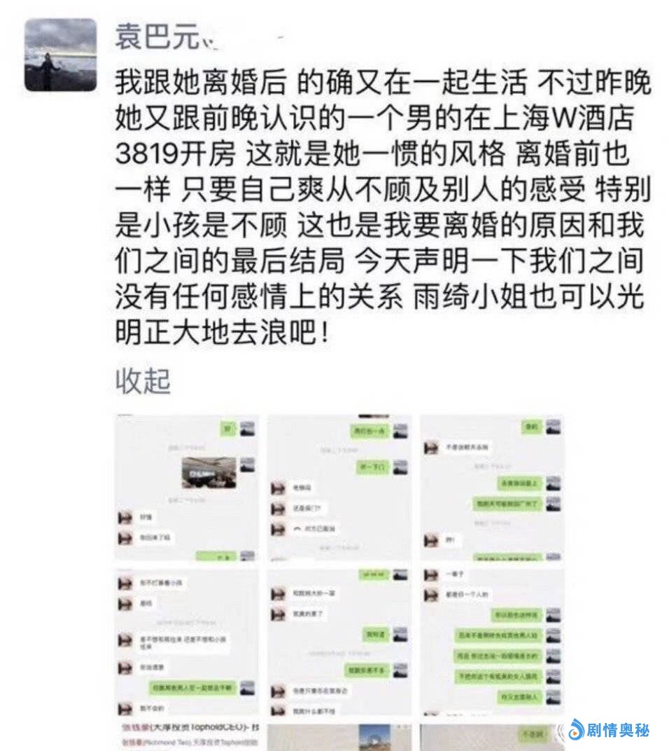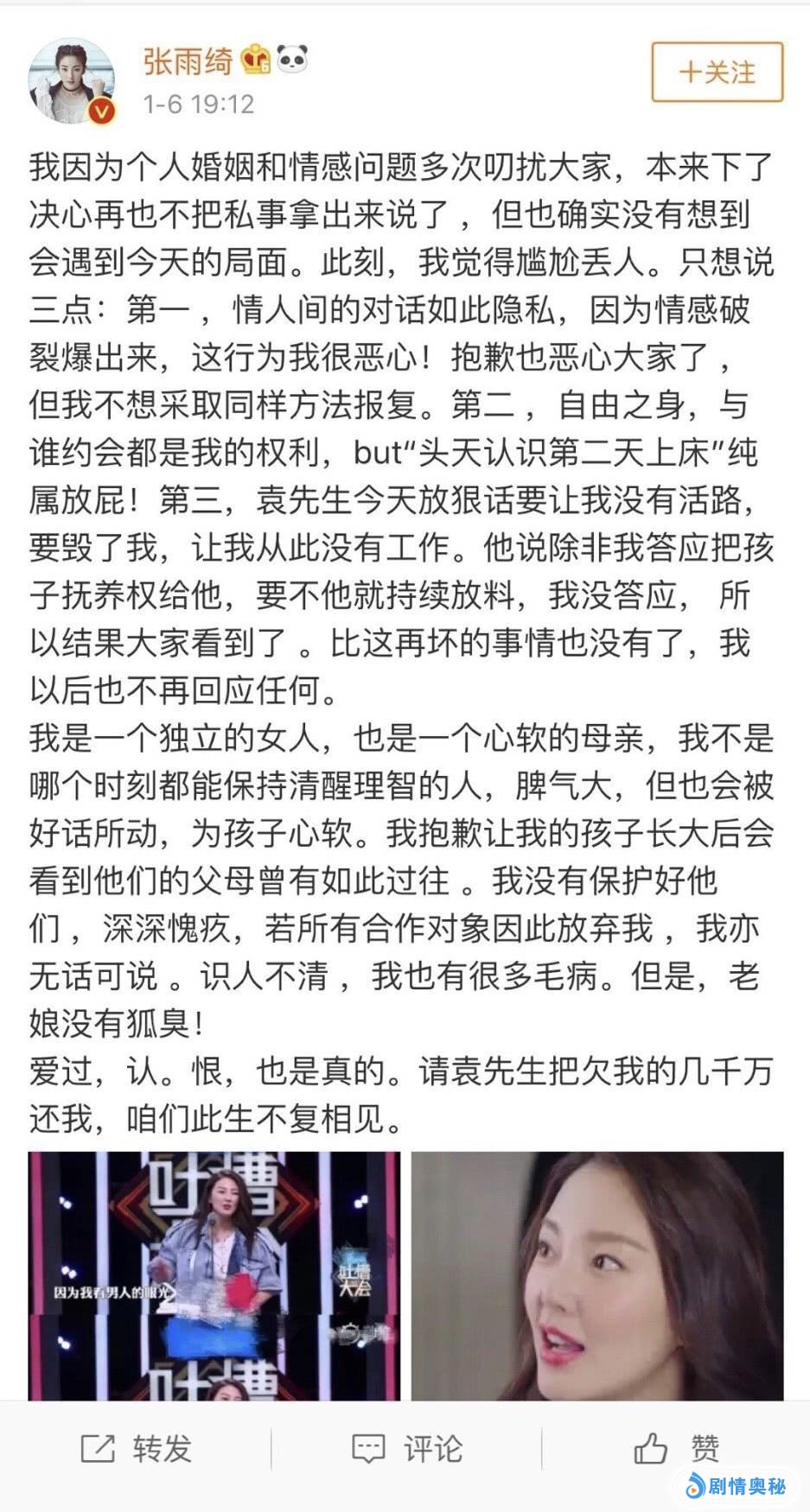 就感觉为什么会有这么多人都在替张雨绮说话?袁巴元确实不是什么好男人,但是,张雨绮似乎也是有问题的。一开始的离婚,后来的又重新在一起,然后被袁巴元曝光聊天记录和说她和别的男性在一起等等,这好像也不是一个好女人应该做的事情吧?不过,每一次张雨绮都是理直气壮,一气呵成的发微博说事情。