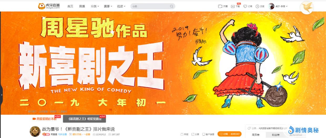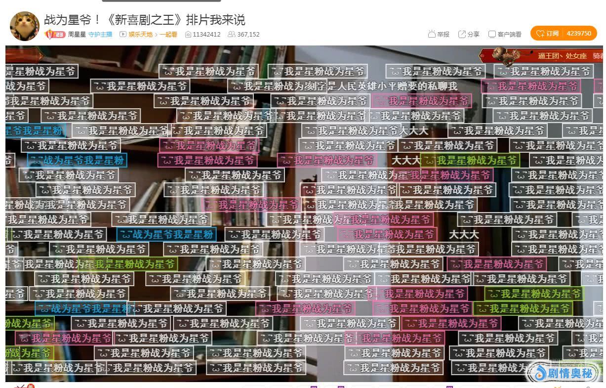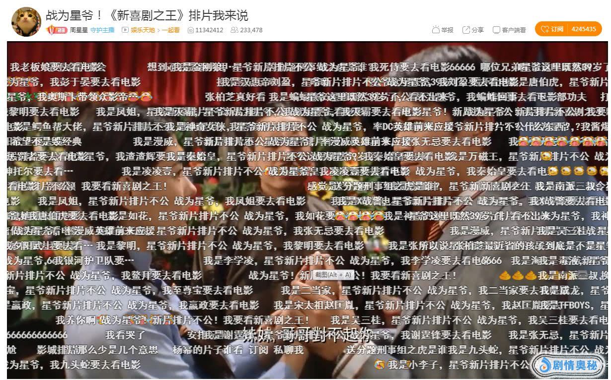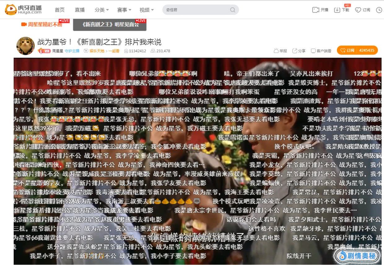 相反另一边周星驰的死忠粉们做出的一系列举行怕是要感动的星爷痛哭流涕。在事件发生之后,星爷的粉丝们就开始发起了为星爷新片应援打call活动,其中最大型的当属当前国内最大直播平台虎牙“一起看”品类的周星星直播间。这位主播是一位周星驰的粉丝,其直播间常年播放周星驰的电影,也被网友们称之为星爷粉丝聚集地,拥有400多万的粉丝。