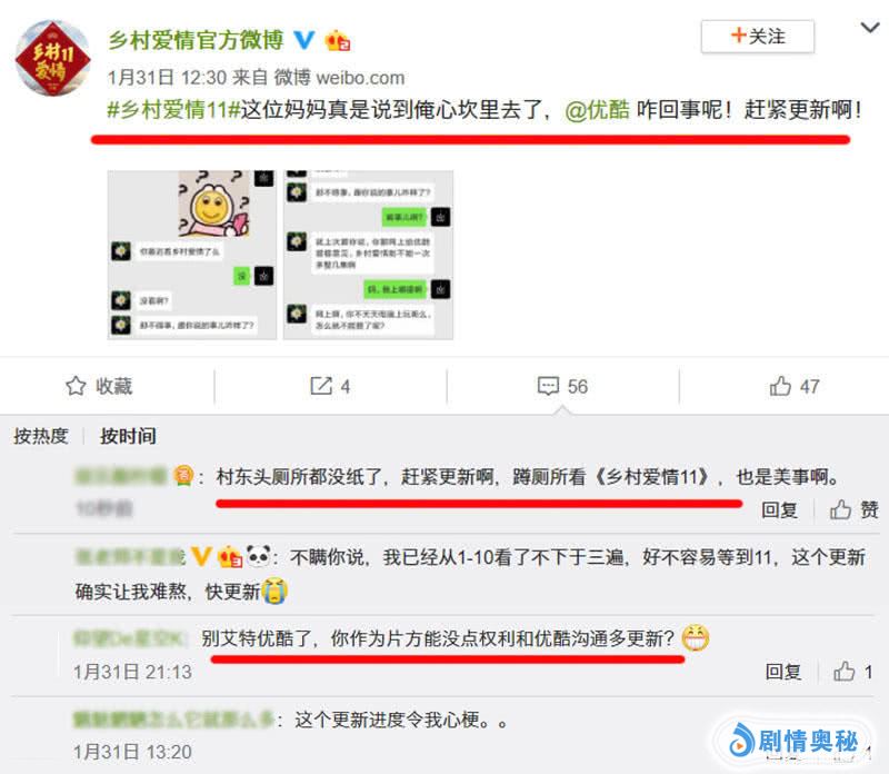 《乡村爱情11》这种网络播放频率,观众们相当不满意,更有人称从第1集到第12集,已经看了四五遍了,网络平台就是不更新,让人难熬。也有乡迷调侃表示:赶紧更新吧,村东头厕所没纸了,蹲厕所追乡爱,也是一种美事啊。