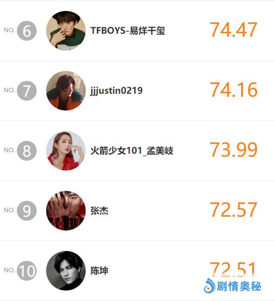 势力指数排在第6~第10位的娱乐圈艺人依次是TFBOYS易烊千玺、黄明昊、火箭少女101孟美岐、张杰,以及登陆热搜的实力派演员陈坤。最后让我们再次恭喜挺进1月最后一期艺人势力榜前十名的艺人,他们为自己在2月的事业发展开了一个好头,你最欣赏其中哪位艺人呢?