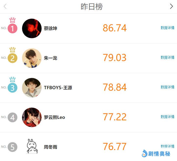 首先看到的是艺人势力指数前五名,在最新一期势力战报中,指数最高的五位娱乐圈艺人依次是Ninepercent蔡徐坤、朱一龙、TFBOYS王源、罗云熙,以及周冬雨,其中iKun斥重金助偶像拿第一(小编不建议花钱打榜),进前三的朱一龙王源再聚首,实力派演员罗云熙位列第四,与TFBOYS易烊千玺合作新片《少年的你》的影后周冬雨排第五。