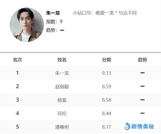 我们最新看到的是电视演员V榜前五名,时下热度最高的五位电视演员依次是朱一龙、赵丽颖、杨紫、邓伦、潘粤明,其中稳居榜单第一的朱一龙刷新了个人纪录,他已经连续36天斩获电视演员V榜冠军,并且连续34天V榜热度指数破9!主演《知否知否》的赵丽颖紧随其后,排在第三名和第四名的杨紫邓伦双双参加2019年猪年春晚,凭《鬼吹灯之怒晴湘西》热度上升的潘粤明重回前五,目前榜单前五名已经基本确定,这五位演员都是口碑人气双丰收的好演员。