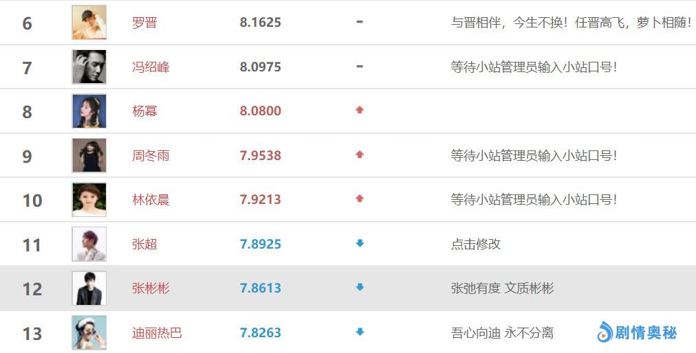 我们接着往下看,位居演员榜单第6~第9位的电视演员依次是领衔主演《幕后之王》的罗晋(与唐嫣登陆北京卫视春晚)、主演《知否知否》的冯绍峰、与蔡徐坤登陆北京卫视春晚的杨幂,以及与TFBOYS易烊千玺合作新片《少年的你》的周冬雨其中罗晋冯绍峰排名不变,杨幂周冬雨热度上升。