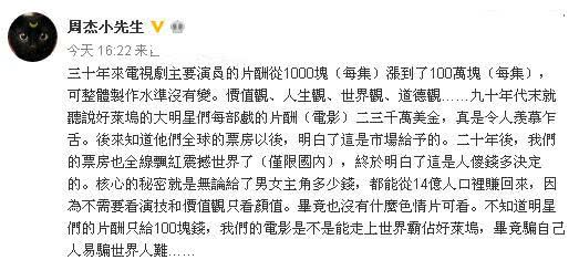 2月2日下午,周杰在社交媒体发文,炮轰国内如今演员片酬高,他说:“三十年来电视剧主要演员的片酬从1000块(每集)涨到了100万块(每集),可整体影视制作水平却没有进步。”