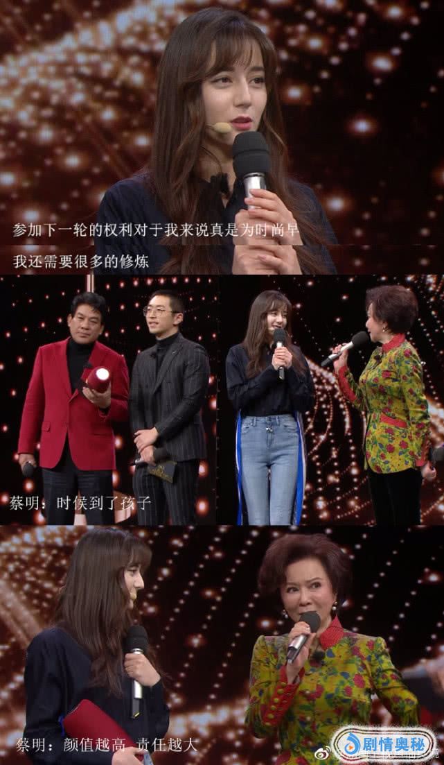 而播出的画面中,可以看到迪丽热巴拿奖的片段是剪了许多,并不连贯。节目中迪丽热巴说觉得自己“为时尚早”,蔡明则说:“到时间了,孩子”,后面还说了一句:“颜值越高,责任越大”。