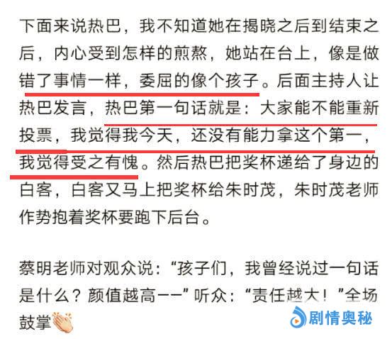 该观众表示,当时宣布迪丽热巴得了第一的时候,迪丽热巴的表情是像做错事了的孩子,而且要求大家重新投票,认为自己受之有愧,还没有能力拿这个第一。并且把奖杯递给了白客,白客又给了朱时茂。最后是蔡明来解的围。