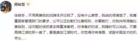 释延觉发文称:徐晓冬,不用再费劲的找媒体评论我了,没有什么意思,我说的很清楚了,我尊重国家管理部门的要求,公平公正的散打比赛规则,你要敢打,你我共同调整比赛级别,没问题的话抓紧去降重准备吧,你准备好的话,我随时可以出战。不要再搞江湖的那一套了,要是真在江湖时代,你觉得你有侮辱、诋毁中国武术的机会么。看得出来,释延觉可谓是非常的愤怒,这一次主动应战,看来是要为传统武术正名。