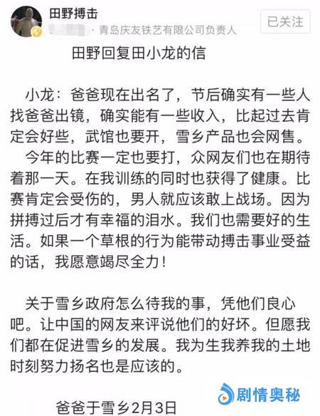没过多久,田野也回复了儿子小龙:爸爸现在出名了,节后确实有一些人找爸爸出镜,确实能有一些收入,比起过去肯定会好些,武馆也要开,雪乡产品也会网售。今年的比赛一定也要打,众网友们也在期待着那一天。在我训练的同时也获得了健康。比赛肯定会受伤的,男人就应该敢上战场。因为拼搏过后才有幸福的泪水。我们也需要好的生活。如果一个草根的行为能带动搏击事业受益的话,我愿意竭尽全力!关于雪乡政府怎么待我的事,凭他们良心吧。让中国的网友来评说他们的好坏。但愿我们都在促进雪乡的发展。我为生我养我的土地时刻努力扬名也是应该的。