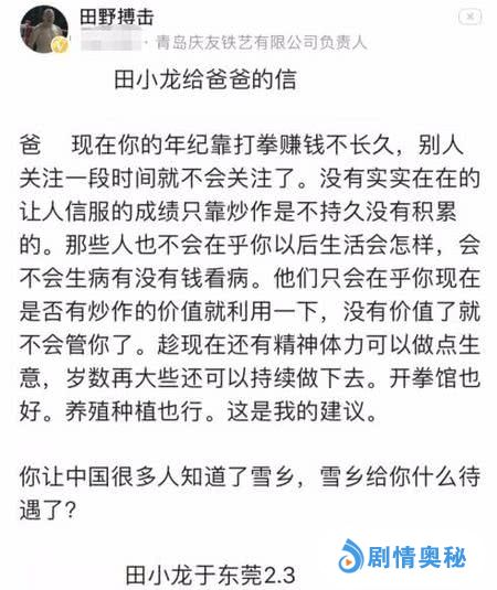 而今天,里和腿大师田野再度发文,公布了自己远在东莞儿子给自己信,打脸外界父子不和的传闻,田野儿子给父亲的信的内容为:爸 ,现在你的年纪靠打拳赚钱不长久,别人关注一段时间就不会关注了。没有实实在在的让人信服的成绩只靠炒作是不持久没有积累的。那些人也不会在乎你以后生活会怎样,会不会生病有没有钱看病。他们只会在乎你现在是否有炒作的价值就利用一下,没有价值了就不会管你了。趁现在还有精神体力可以做点生意,岁数再大些还可以持续做下去。开拳馆也好。养殖种植也行。这是我的建议。你让中国很多人知道了雪乡,雪乡给你什么待遇了?