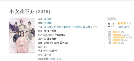 排名紧挨着《知否》的电视剧是《小女花不弃》,该剧是根据桩桩同名小说改编的古装励志轻喜剧,由林依晨、张彬彬、林柏宏、孙祖君等人联袂主演,同时也是林依晨暌违荧屏许久的又一力作。该剧的周播量收获了14.3亿的成绩,与《知否》的周播放量相差近一倍,豆瓣评分相差1.5分,虽遥遥不及《知否》,但成绩也算可观。