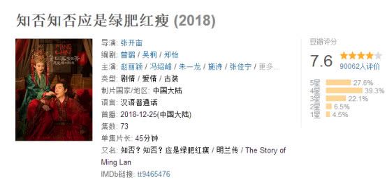 如今,《知否》不断刷新成绩,收视超过1.7,直逼2.0大关,网播量也是节节攀升,几位主演的各种数据也相当不错。虽然这部剧在“病句”方面有着不小的争议,但是其口碑相当不错,豆瓣评分7.6分。