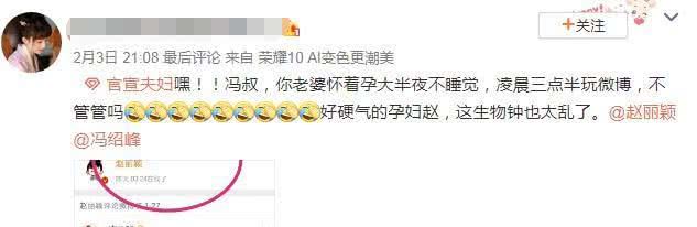 而近日,有细心的网友便注意到赵丽颖除了在每晚《知否》播完后上线外,近日她也是接二连三半夜上线玩微博,对此,有网友也喊话冯绍峰表示:“嘿!!冯叔,你老婆怀着孕大半夜不睡觉,凌晨三点半玩微博,不管管吗?好硬气的孕妇赵,这生物钟也太乱了。”