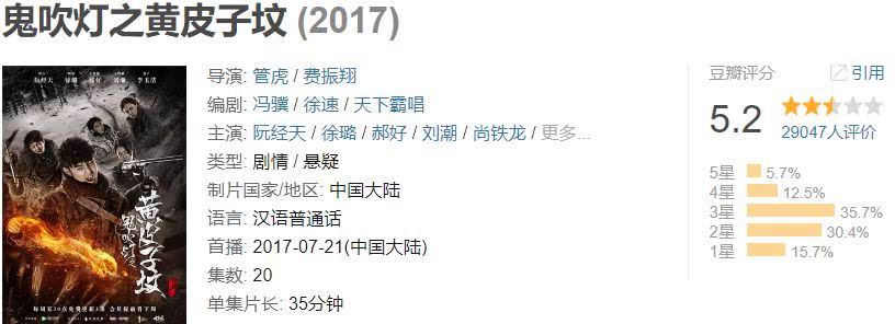 2017年,腾讯和爱奇艺再次发力,前者与管虎导演合作打造了《鬼吹灯之黄皮子坟》,由偶像演员阮经天和徐璐主演;后者推出了《鬼吹灯之牧野诡事》,由自带话题的王大陆和金晨主演。这两部偏年轻化的盗墓剧不仅口碑均不及格,流量成绩也并不理想。它们的表现,也证明了曾经的“盗墓笔记”和“老九门”流量模式正在失去流量效应。