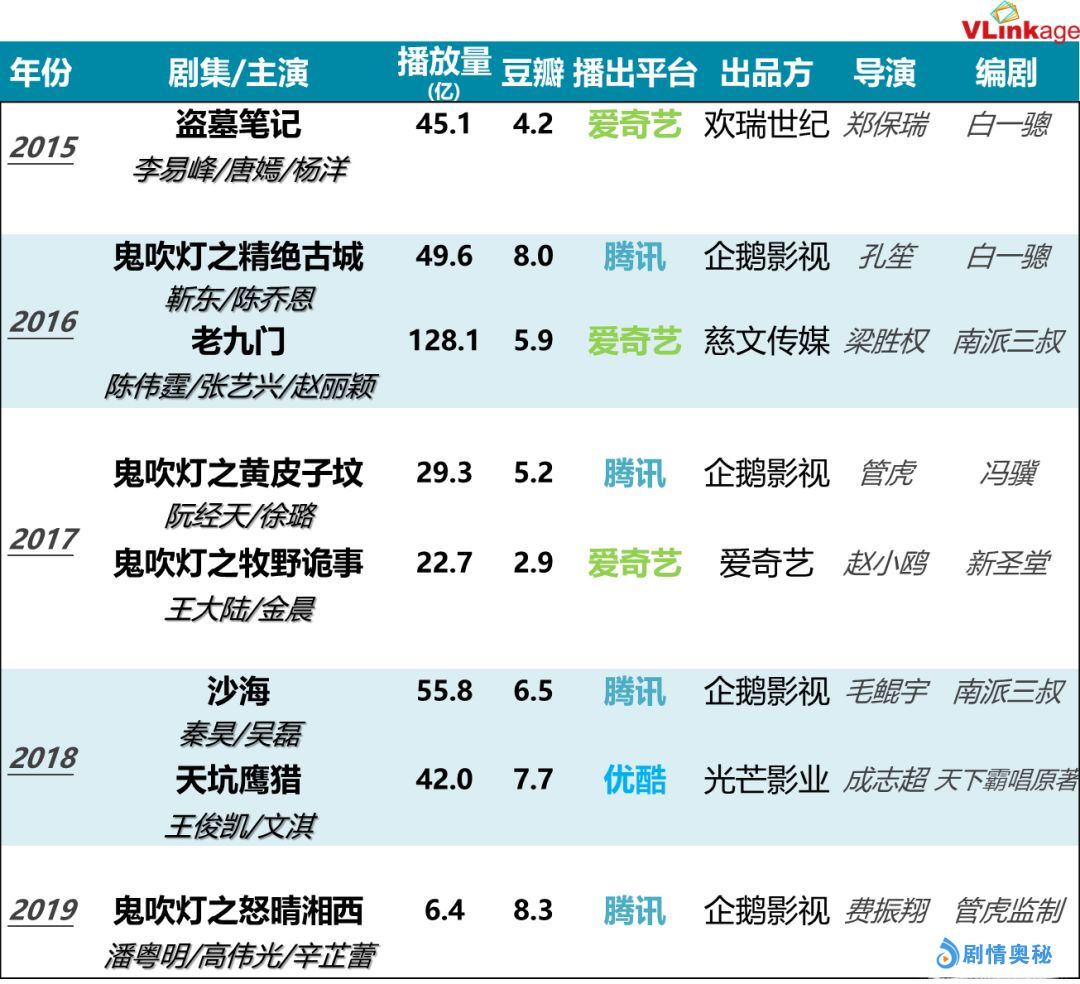 我们盘点了近几年开发的盗墓剧,其流量和口碑表现如下图。从这些作品的阵容和流量可以看出很明显的“流量”进化史。