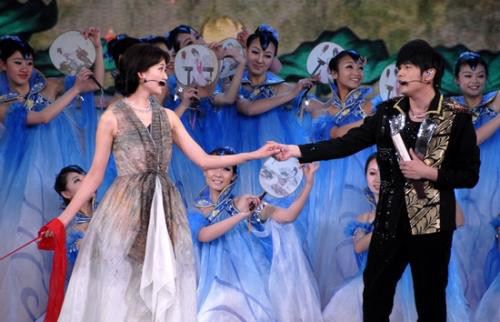 虽然也是歌舞,但《兰亭序》当时也经过了一番别出心裁的设计,周杰伦唱到《兰亭序》的动情之处时,转身抽开幕布,展现出端坐在竹椅上的林志玲。随后两人一唱一和,多才多艺的林志玲还跳了一段丝带舞。