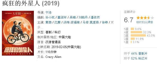 电影《流浪地球》春节上映后,两天票房突破3.8亿,豆瓣口碑8.3分,而同天上映由宁浩执导,黄渤、沈腾主演同是科幻类题材的《疯狂的外星人》,口碑才6.7分。