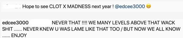 有网友就在陈冠希动态下留言希望下一年和余文乐品牌合作!陈冠希看到网友留言后,霸气回应:“NEVER THAT!WE MANY LEVELS ABOVE THAT WACK SHXT……NEVER KNEW U WAS LAME LIKE THAT TOO / BUT NOW WE ALL KNOW …… ENJOY(不可能!我们的级数更高,从不知道你会说像这样的话,但是我现在知道了!)”