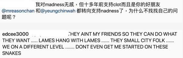 这段留言引发了双发粉丝激战,有人在陈冠希动态下留言说:“10多年前,陈奕迅和杨千嬅都是支持你的,现在都去支持余文乐了!为什么不找找自己的问题呢?”这段留言激怒了陈冠希,陈冠希回复说:“他们不是我的朋友,物以类聚!”最后还留言说:“THESE SNAKES(身边的都是假朋友)”